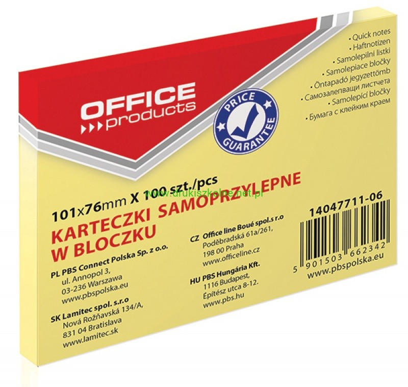 Bloczek samoprzylepny OFFICE PRODUCTS, 101x76mm, 1x100 kart., pastel, jasnożółty