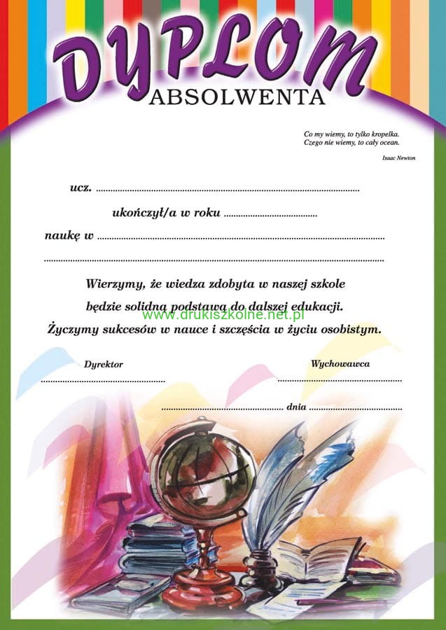 Nowoczesny Dyplom wykonany z najwyższej jakości papieru satynowanego o gramaturze od 200 g do 300 g. Format dyplomu - A4. Pełno kolorowy, jednostronny nadruk. Dyplom nadaje się się do personalizacji za pomocą drukarek atramentowych i laserowych, produkt najwyższej jakości. Surowce stosowane do produkcji oferowanych przez nas dyplomów, to najlepsze na rynku kartony ozdobne, gwarantujące najwyższą jakość oferowanych przez nas wyrobów. Nowoczesne technologie poligraficzne, zapewniają estetyczny wygląd Dyplomów oraz pełne bezpieczeństwo w kontakcie z naszymi produktami.
