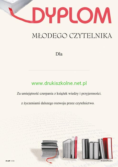 Dyplom młodego czytelnika. Dyplom wykonany z sztywnego kartonu ozdobnego. Format dyplomu - A4. Pełno kolorowy, jednostronny nadruk. Dyplom nadaje się się do personalizacji za pomocą drukarek atramentowych i laserowych, produkt najwyższej jakości. Surowce stosowane do produkcji oferowanych przez nas dyplomów, to najlepsze na rynku kartony ozdobne, gwarantujące najwyższą jakość oferowanych przez nas wyrobów. Nowoczesne technologie poligraficzne, zapewniają estetyczny wygląd Dyplomów oraz pełne bezpieczeństwo w kontakcie z naszymi produktami.