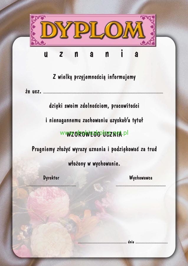 Nowoczesny Dyplom wykonany z najwyższej jakości papieru satynowanego o gramaturze od 200 g do 300 g. Format dyplomu - A4. Pełno kolorowy, jednostronny nadruk. Dyplom nadaje się się do personalizacji za pomocą drukarek atramentowych i laserowych, produkt najwyższej jakości. Surowce stosowane do produkcji oferowanych przez nas dyplomów, to najlepsze na rynku kartony ozdobne, gwarantujące najwyższą jakość oferowanych przez nas wyrobów. Nowoczesne technologie poligraficzne, zapewniają estetyczny wygląd Dyplomów oraz pełne bezpieczeństwo w kontakcie z naszymi produktami.