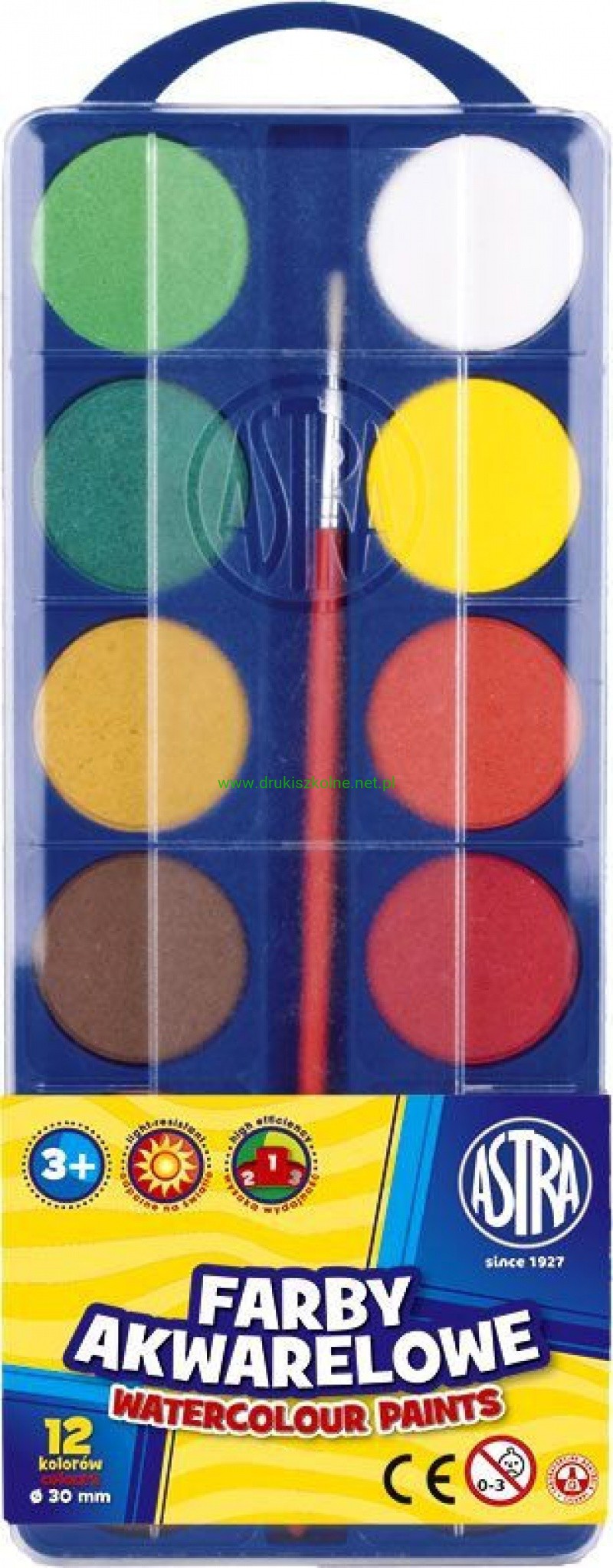 Farby akwarelowe Astra 12 kolorów - fi 30,0 mm z eurozawieszką