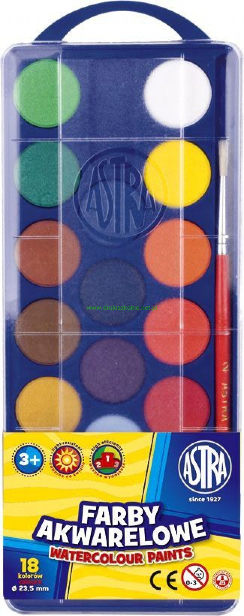 Farby akwarelowe Astra 18 kolorów - fi 23,5 mm z eurozawieszką