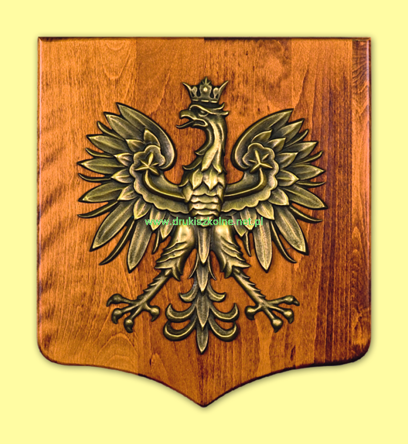Godło Rzeczpospolitej Polskiej (Godło Polski) mosiądzowane na tarczy drewnianej w trzech różnych wymiarach. Godło - wykonane jako odlew z aluminium, orzeł jest mosiądzowany, oxydowany i lakierowany bezbarwnie. Tarcza - to gruba deska bukowa (ciemny buk starzony). Godło państwowe na tarczy stanowi ekskluzywną ozdobę dla urzędów, sądów, kancelarii notarialnych i gabinetów dyrektorów placówek oświatowych. Produkt jest przystosowany do powieszenia na ścianie. Godło wyprodukowano zgodnie z ustawą o godle, barwach i hymnie Rzeczpospolitej. Produkt najwyższej jakości.