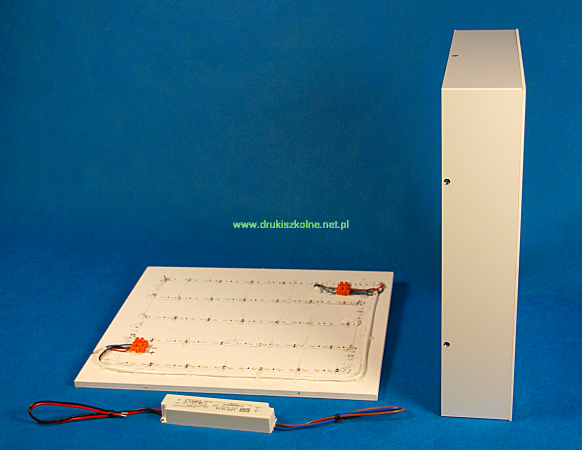 W skład zestawu wchodzi kaseton z nadrukowanym godłem, obudowa, panel LED-owy, zasilacz panelu LED-owego oraz samoprzylepne zaślepki służące do zamaskowania wkrętów montażowych na bokach kasetonu po całkowitym zakończeniu montażu kasetonu.
