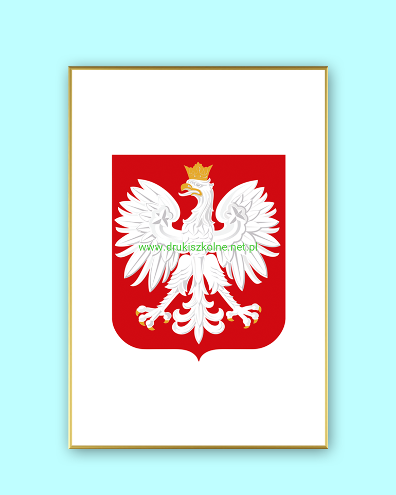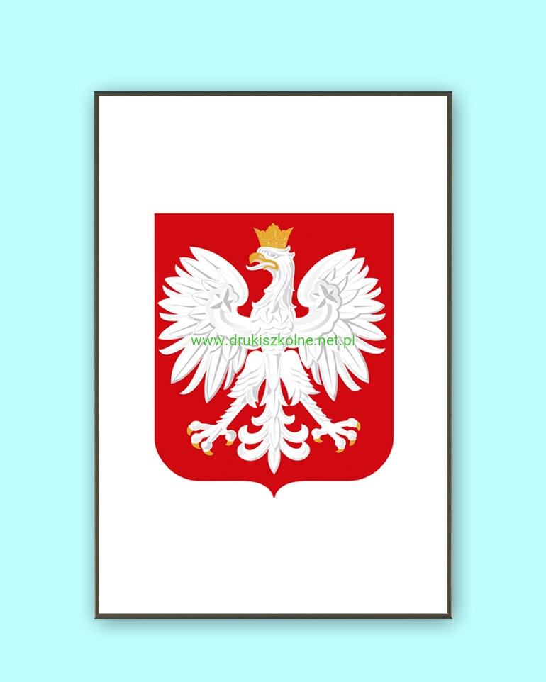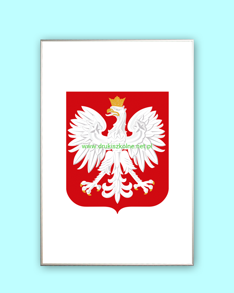 Godło Rzeczpospolitej Polskiej (Duże) - dla szkół, rozmiar 60 cm x 90 cm, wydrukowane na papierze offsetowym, oprawione w dużą aluminiową, srebrną ramę. Produkt przystosowany do powieszenia na ścianie. Godło wyprodukowano zgodnie z ustawą o godle, barwach i hymnie Rzeczpospolitej.