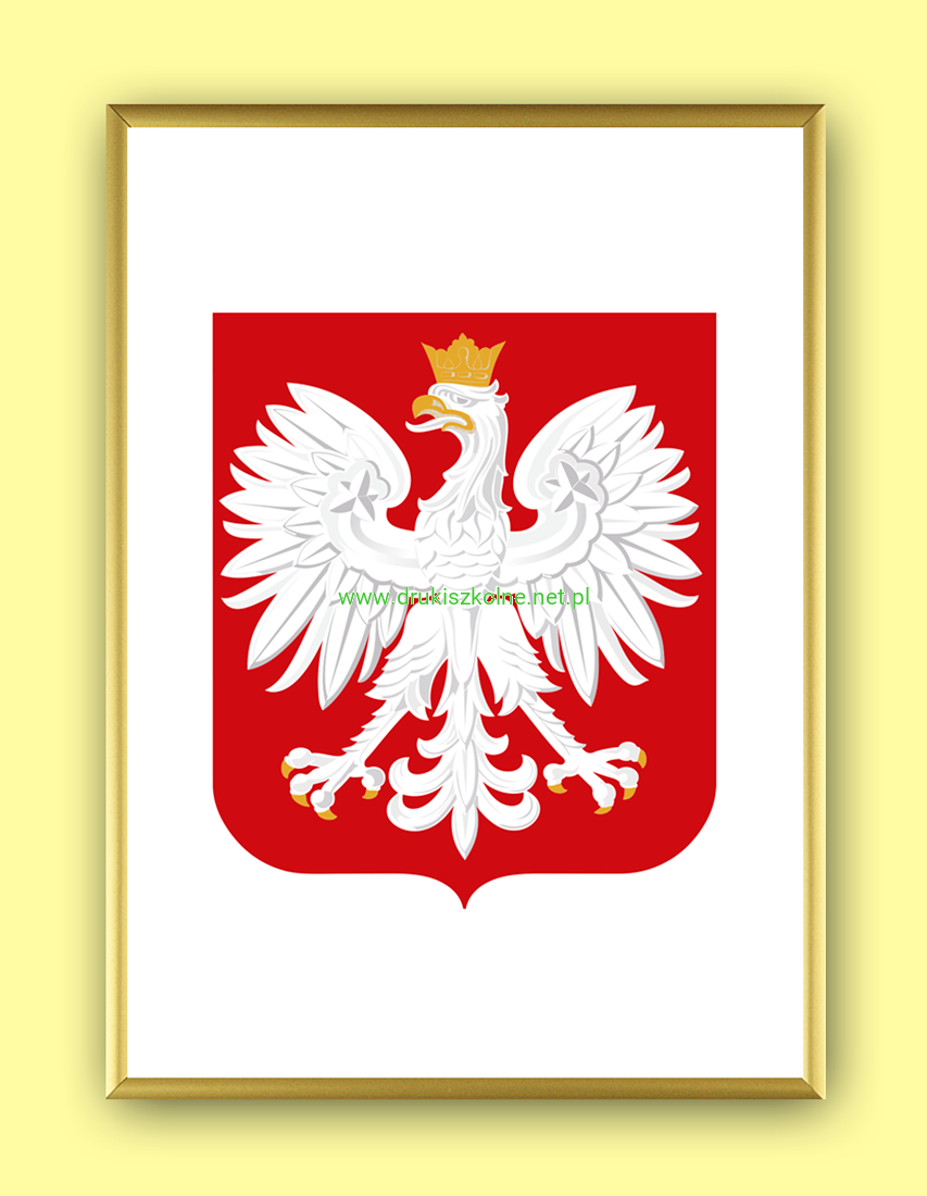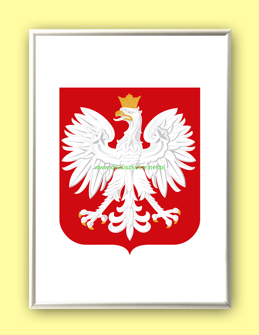 Godło Rzeczpospolitej Polskiej (Godło Polski) w aluminiowej ramce 50 cm x 40 cm (różne kolory ramek) wydrukowane na kartonie offsetowym, oprawione w ramkę aluminiową, w wybranym kolorze. Produkt przystosowano do powieszenia na ścianie. Godło wyprodukowano zgodnie z ustawą o godle, barwach i hymnie Rzeczpospolitej. Ekskluzywny produkt najwyższej jakości.