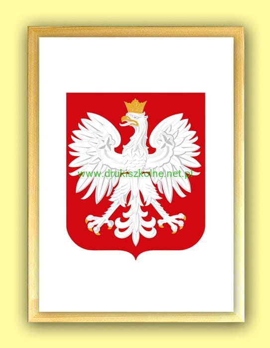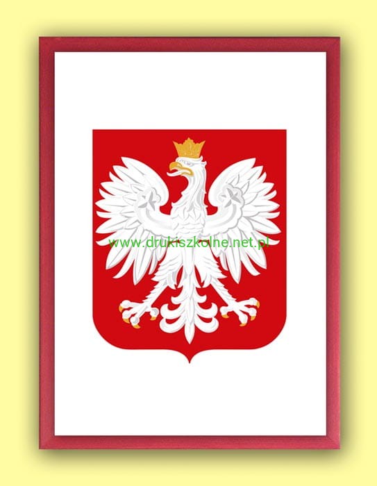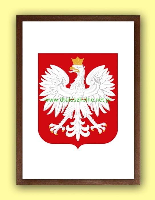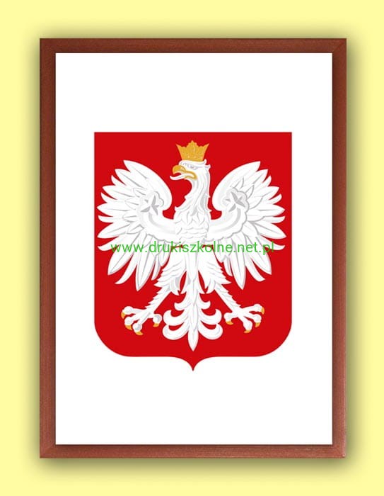 Godło Rzeczpospolitej Polskiej (Godło Polski) w prostokątnej drewnianej ramce A3+ przeznaczone dla szkół i urzędów. Godło wydrukowano na kartonie offsetowym i oprawiono w ramkę drewnianą w wybranym kolorze. Godło przystosowane jest do powieszenia na ścianie. Godło wyprodukowano zgodnie z ustawą o godle, barwach i hymnie Rzeczpospolitej.