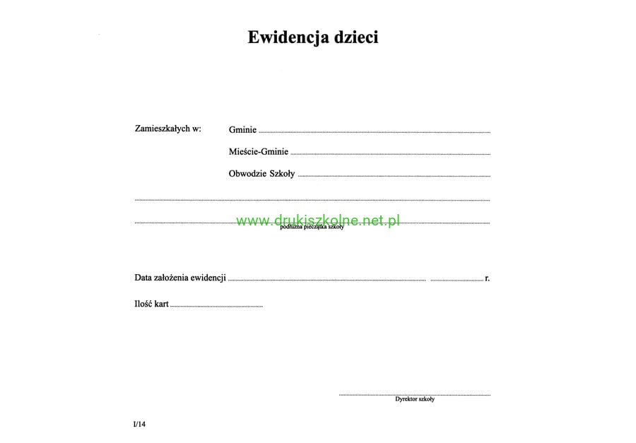 I/14 - Księga ewidencji dzieci - dla szkół podstawowych, (208 str.) 265mm x 220mm, twarda oprawa skóropodobna, różne kolory okładek (wybrane kolory proszę podać w uwagach do zamówienia - w przypadku braku informacji o wyborze kolorów, wysyłamy w kolorach losowo wybranych. W przypadku braku któregoś koloru proponujemy inne kolory).