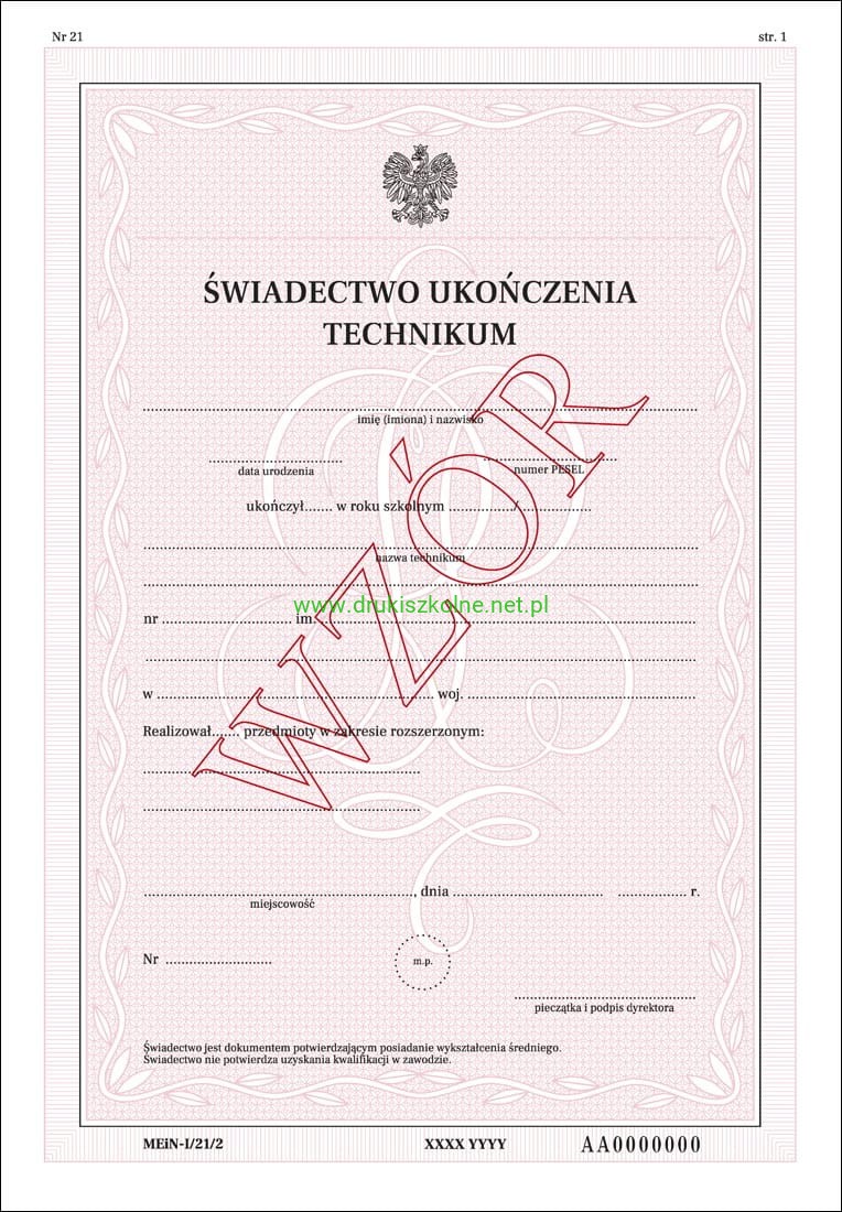 MEiN-I/21/2 - formularz świadectwa szkolnego dla uczniów technikum, świadectwo z zabezpieczeniami - A4 (4 str.) TYLKO DLA PLACÓWEK OŚWIATOWYCH