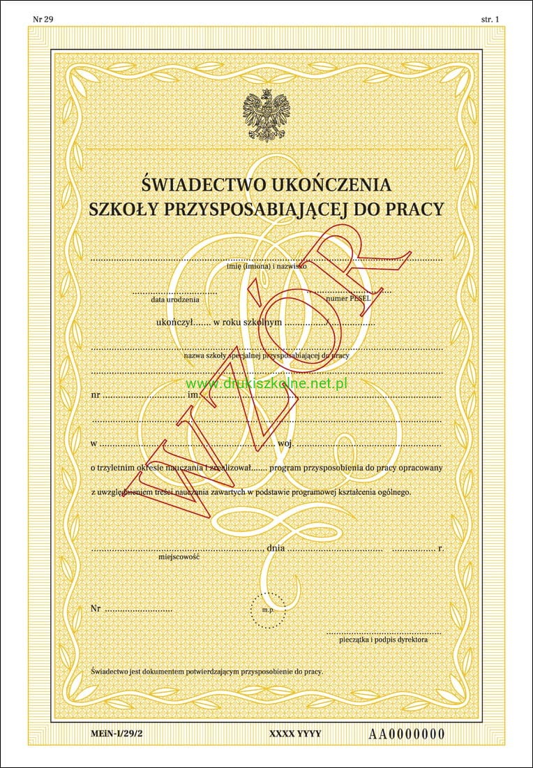 MEN-I/29/2 - formularz świadectwa szkolnego dla uczniów szkoły specjalnej przysposabiającej do pracy, świadectwo z zabezpieczeniami, A4 (4 str.) TYLKO DLA PLACÓWEK OŚWIATOWYCH