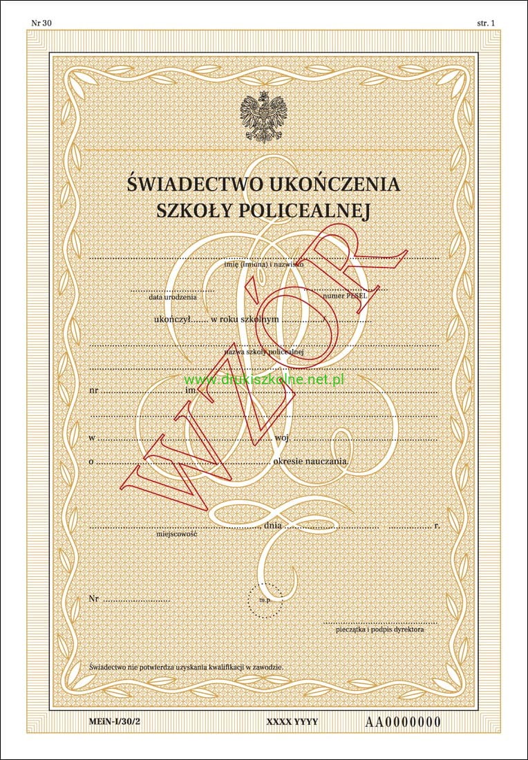 MEN-I/30/2 - formularz świadectwa szkolnego dla uczniów szkoły policealnej dla młodzieży oraz dla słuchaczy szkoły policealnej dla dorosłych, świadectwo z zabezpieczeniami - A4(2 str.) TYLKO DLA PLACÓWEK OŚWIATOWYCH