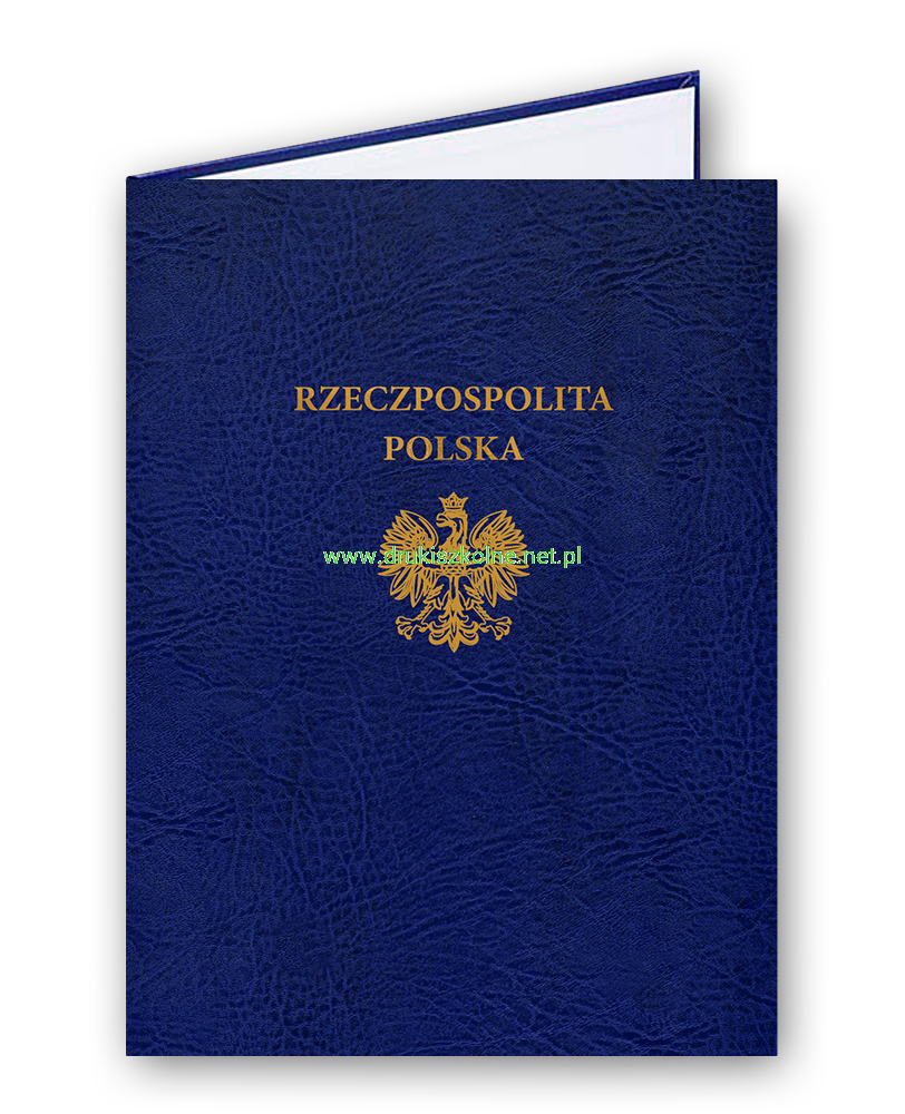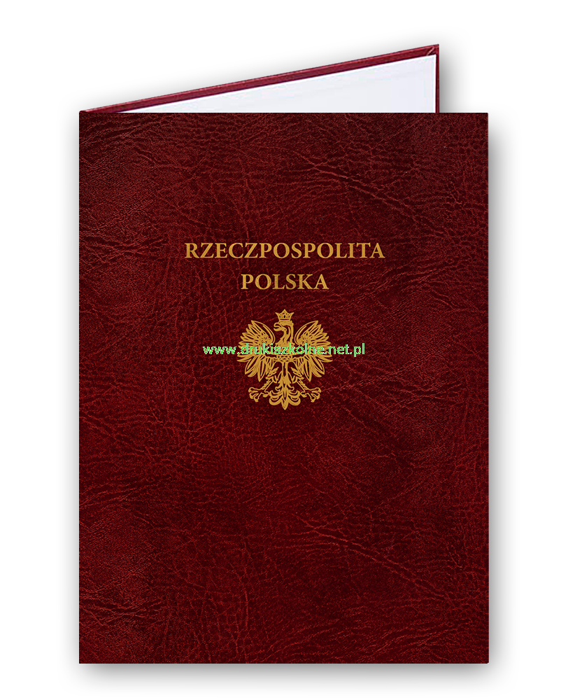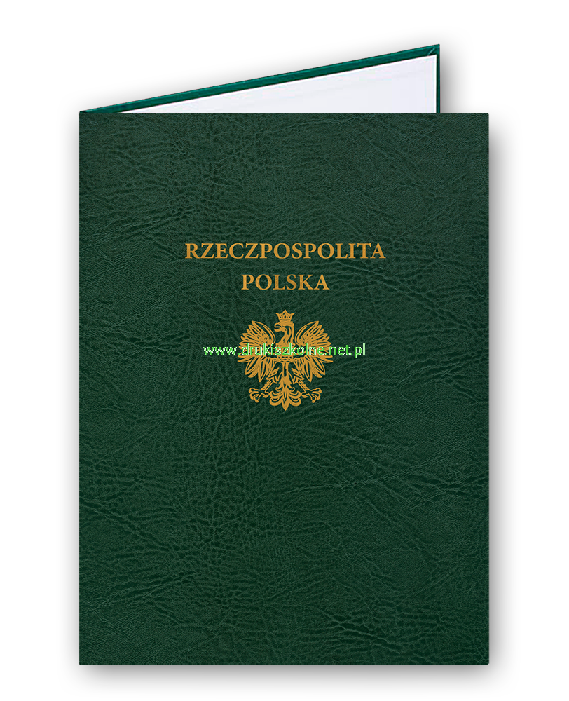 Teczka (Okładka) ozdobna na dyplom lub dokument ze złotym, ozdobnym napisem "Rzeczpospolita Polska" i godłem - imitacja skóry, format A4, wykonana z twardej tektury, oklejona materiałem introligatorskim imitującym skórę. Z przodu wytłoczony złoty napis, kolor okleiny do wyboru, we wnętrzu specjalny pasek z PCV przytrzymujący znajdujący się w środku dokument. Produkt najwyższej jakości.