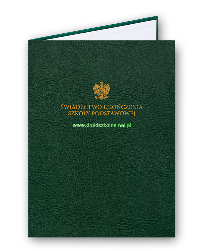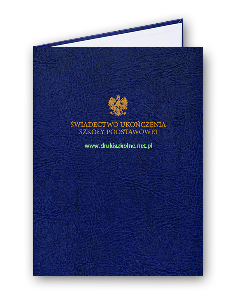 Teczka (Okładka) ozdobna na dyplom lub dokument ze złotym, ozdobnym napisem "Świadectwo Ukończenia Szkoły Podstawowej" - imitacja skóry, format A4, wykonana z twardej tektury, oklejona materiałem introligatorskim imitującym skórę. Z przodu wytłoczony złoty napis, kolor okleiny do wyboru, we wnętrzu specjalny pasek z PCV przytrzymujący znajdujący się w środku dokument. Produkt najwyższej jakości.