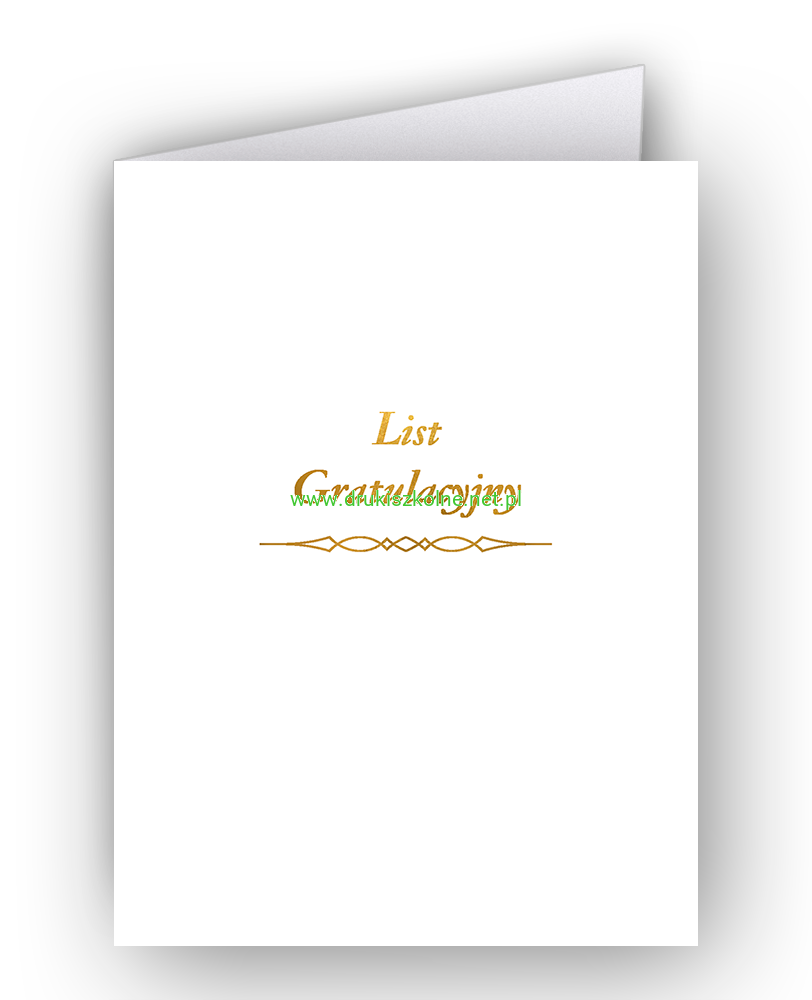Teczka ozdobna, kartonowa ze złoconym napisem "List Gratulacyjny", przeznaczona na dokumenty formatu A4, wykonana z białego kartonu ozdobnego. Wewnątrz transparentne uszko z tworzywa sztucznego podtrzymujące dokument. Produkt najwyższej jakości.