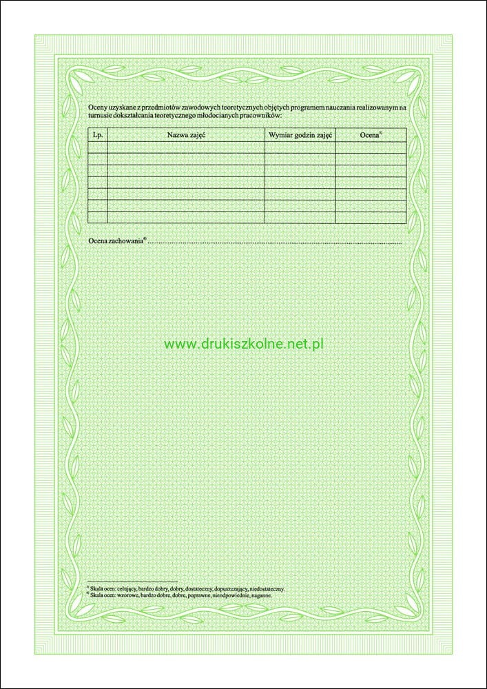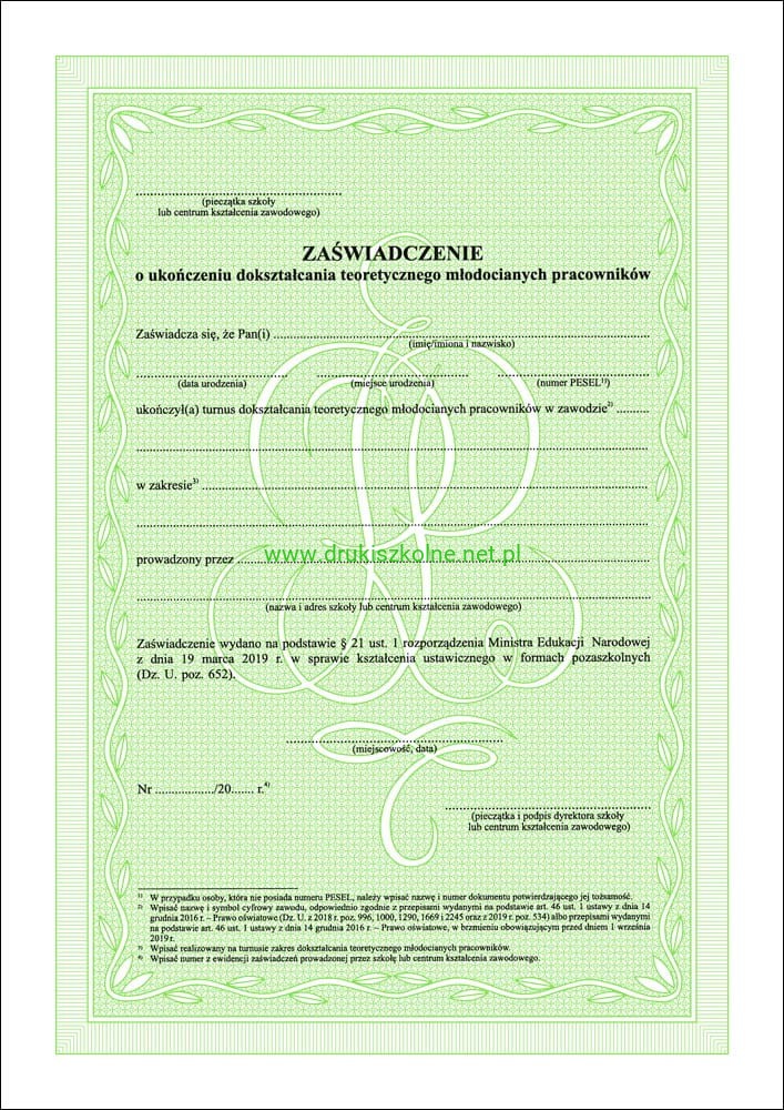 ZAŚWIADCZENIE o ukończeniu dokształcania teoretycznego młodocianych pracowników A4 (2 str.) Zaświadczenie zgodne z Rozporządzeniem Ministra Edukacji Narodowej z dnia 19 marca 2019 r. w sprawie kształcenia ustawicznego w formach pozaszkolnych